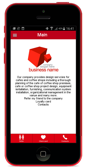 एप्लिकेशन में आपके ग्राहक के लिए आवश्यक सभी जानकारी शामिल होगी: समाचार, कंपनी की जानकारी, स्थान मानचित्र, संपर्क, फीडबैक फॉर्म, लॉयल्टी प्रोग्राम की जानकारी और बहुत कुछ। आपकी कंपनी के बारे में सारी जानकारी आपके सभी ग्राहकों के लिए आसानी से उपलब्ध होगी।
