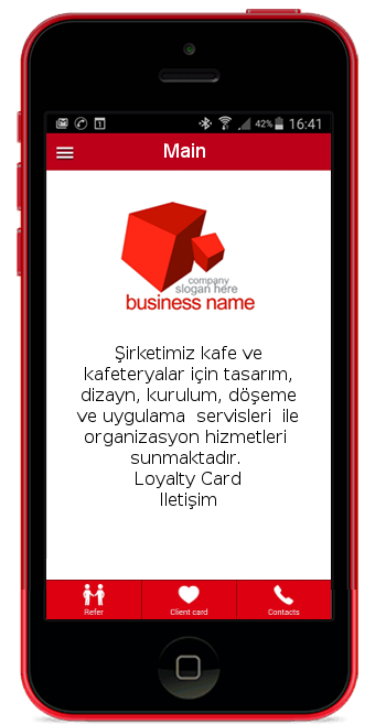 Uygulama müşterinizin ihtiyacı olan bütün bilgileri içerir; haberler, şirket bilgileri, konum ve iletişim bilgisi, yorum formu, bağlılık programi ve daha birçok bilgiyi barındırır. Müşterileriniz şirketiniz hakkındaki bütün bilgilere kolayca erişebilecek.